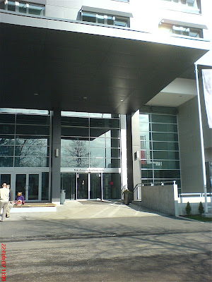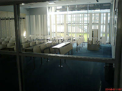 Ein ca. 15 Meter breiter Flur, eine perfekt englisch sprechende Rezeption (!) und Bänke zum Sitzen krönen den Eingang des gläsernen Gebäudes. Anders als in Bremen (ich denke an die Glashalle) setzt sich diese gläserne "Freundlichkeit" im ganzen Gebäude fort. Insgesamt 20 Räume im Erdgeschoß sind zum Flur hin verglast, so dass man in jeden Raum hinein- und aus jedem Raum hinausschauen kann. Auf diesem Glas befinden sich Strichcodes mit Zahlen, wahrscheinlich anlehnend an Strichcodes von Verpackungen. War da ein kritischer Architekt am Werk?